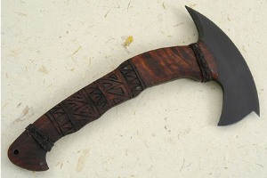 An upward curved end provides a reinforce grip. The haft is formed from dyed curly maple. Tribal markings both provide visual interest and a sure grip.