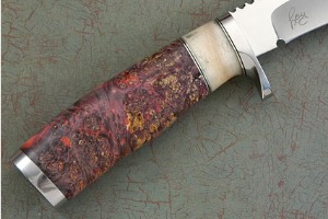 Description: Bob Lay's designs are well thought through and show an amazing degree of craftsmanship. The stabilized red box elder burl hand has a convoluted figure that is nicely highlighted by blond sheep horn. Thin black fiber spacers assist the handle to adjust to temperature and humidity changes. The stainless steel guard and butt cap create a perfect balance in the hand. By mirror polishing the flats of the blade and satin finishing the grinds, Bob creates a knife with grind lines that are very dramatic. The blade has been heat treated to Rc 58.5 for optimal edge retention. Accompanied by certificate from the maker.