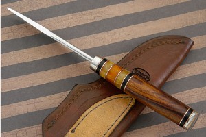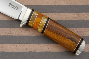 The hollow ground 154 CPM stainless steel blade is hardened to Rc59-60 so as to ensure that the edge will remain razor sharp through the most difficult tasks, yet will be easy to sharpen. The handle is formed from 7 stacked layers. Ironwood is combined with black micarta, yellow amber and fire amber. Red fiber spacers alternate with nickel silver, assisting the handle to adjust to changes in humidity and temperature. Excellent fit and finish throughout.