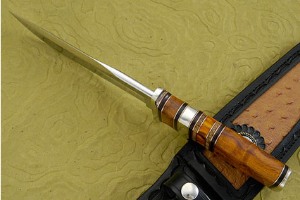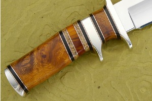 Arizona desert ironwood is nicely set against African blackwood, oosic, and fire amber spacers. Red fiber spacers assist the handle to adjust to changes in temperature and humidity. The nickel silver sub-hilt guard brings the weight back into the handle for an exceptional balance. Excellent fit and finish throughout.