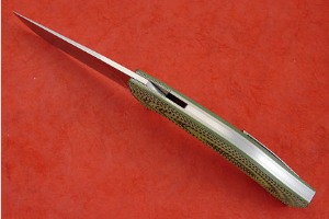 3D textured G10 provides a sure, comfortable grip. Titanium liners and a titanium backbar keep the knife light and fast. It is easy to keep this handmade folder close at hand with the pocket clip mounted for tip-up carry. Excellent fit and finish throughout!