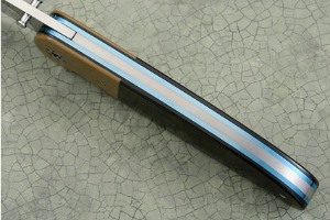 The scales combine black G10 with coyote brown G10 in a finely fitted inlay. Rather than using two separate pieces end-butted together, Andre created the G10 handle and inlaid a separate section of coyote brown G10 into the bolster section. This results in very strong scales! The handle is completed with blue anodized titanium liners. Exceptional fit throughout.