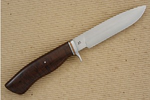 This hunter features a 5.4 inch blade, hand forged to shape from 1084 carbon steel. By differentially heat treating the steel, Bruce created a knife with a keen, long lasting edge and a supportive, durable spine. A hand rubbed finish lends an heirloom quality to the knife.