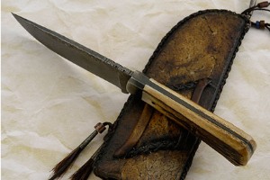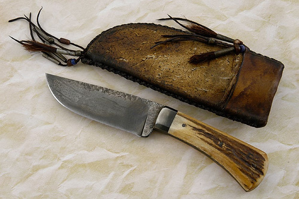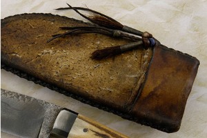 The knife is accompanied by a sheath by Karen Shook. The frontier style sheath is formed from vegetable tanned leather on the inside with a rawhide wrap. Deer hide thongs from collar and tip are decorated with glass beads, tin cones and horse hair.