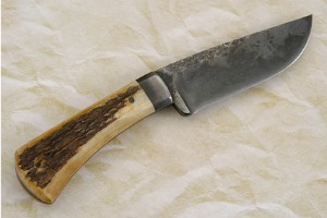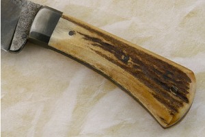 The handle is formed from elk antler and is secured to the distal tapered full tang with three carbon steel pins. The handle is extremely comfortable in the hand.
