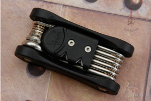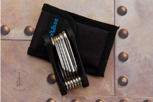 It includes twelve tools including a T6, T8, T10 Torx, standard hex key sizes (1/20" - 1/16" - 5/64" - 3/32" - 7/64" - 1/8"), 0.05" to 0.25", a flathead screwdriver, a #2 Philips head screwdriver, a ceramic honing rod, and a carbide field sharpening tool in nylon pouch.