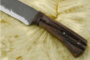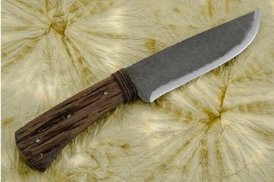 This Primitive Oak Handled Belt Knife has a tremendous sense of presence. The carbon steel blade was forged to shape from 1095 file steel. Daniel convex ground the edge, leaving dramatic file marks in the flats. The spine has been lightly fileworked for a secure thumb purchase.