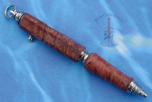 This unique Bolt Action Pen is formed from polished stainless steel and box elder burl. It is extremely comfortable to hold. The top is completed with a lanyard loop. The ball point retracts and locks both in open and closed positions using the bolt action mechanism. The cartridge is a Caran d'Ache of Switzerland and is the Giant Cartridge (Goliath), Medium tip in black. It can be easily changed by unscrewing the front of the pen.