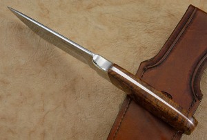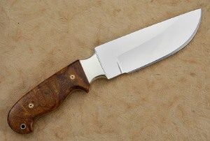 Arizona desert ironwood scales are set on the distal tapered full tang. Polished nickel silver bolsters are dovetailed to the ironwood for a perfect fit. Red fiber spacers assist the handle to adjust to temperature and humidity changes. The handle is completed with a nickel silver lanyard loop and mosaic pins. Excellent fit and finish throughout.
