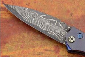 The etched damascus blade is formed from stainless steels. A VG10 stainless steel core provides exceptional edge holding. Polished carbon fiber scales are set on anodized titanium liners, keeping the knife light and durable. Excellent work throughout!