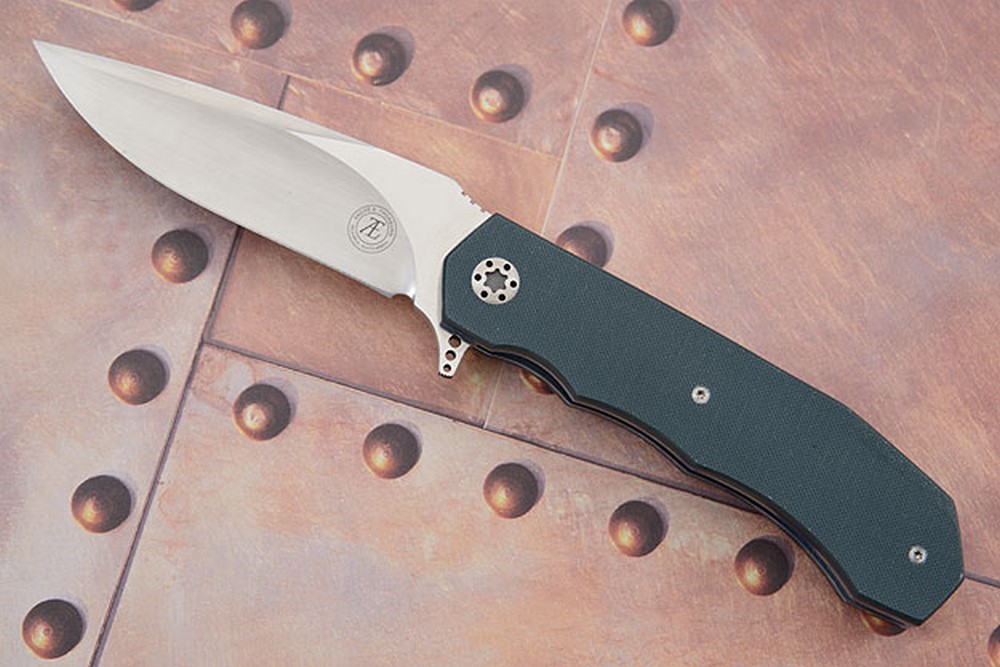 Forest green G10 scales have just enough texture for a secure grip. The anodized titanium clip is mounted for tip-up carry. The handle is completed with blue anodized titanium liners. Exceptional fit throughout. Perfectly centered blade with smooth action.