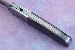 Blue anodized titanium liners support 416 stainless steel bolsters and carbon fiber scales. The bolsters have been meticulously hand engraved by Belgium-born artist Julien Marchal. Julien studied engraving and gun making at Léon Mignon Liège in Belgium. A complex bouquet of flowers and floral scroll adorns the surface of the steel. The centers of some of the flowers are inlaid with 24kt gold, for a dramatic effect. Titanium liners are meticulously hand fileworked in a vine pattern. Extreme attention to detail has been paid throughout this knife, and has exceptional fit and finish.