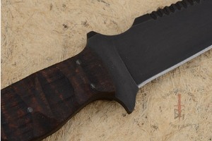 Truly a multi-tasker, this knife is well suited to a wide range of chores and environments. A full skeletonized tang enhances overall balance without compromising strength. The handle shape and double guard provide security as well as various grip options. The hand sculpted maple handle is slip-resistant for a sure grip. Wide bevels and a diamond cross section tip mean low cutting drag and unfailing performance. Sharpened serrations for sawing rope/fiber are located on the top of the blade, leaving the full length of the cutting edge intact.