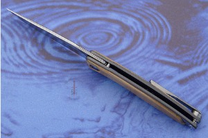 This Mnandi features ancient wooly mammoth ivory bark scales. The scales are inlaid into the frame rather than being simple overlays. This presentation grade mammoth ivory is from the very outside of the tusk and combines light caramel tones with hints of blue/green created from mineralization. The blade is made from S35VN stainless steel for strength and keen edge retention. Both the frame and pocket clip are formed from 6Al4V titanium, keeping this knife extremely light and durable. The clip is mounted for tip up carry. The knife can be comfortably opened and closed with one hand and locks open for safety. The thumb rest is fileworked for dependable handling. The Mnandi features a strong integral locking mechanism that Chris Reeve popularized.
