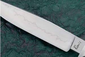 The blade was forged to shape from W2 carbon steel. The undulating heat treatment line is called a hamon and shows the transition between the softer, supportive spine and the keen, long lasting edge. A hand rubbed satin finish lends an heirloom quality.