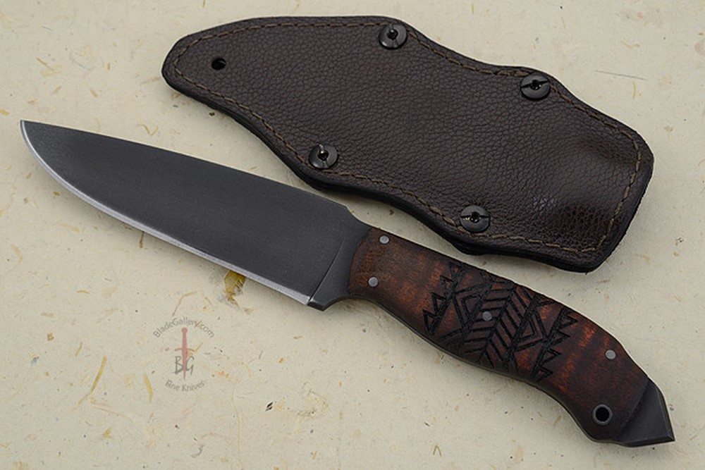 As a conventional knife, the Spike is made from 3/16" 80CrV2 carbon steel with a non-glare Caswell finish. The drop point design means that the blade's energy is centered, thus minimizing drift. Handle contours make it possible to comfortably reverse grip when utilizing the spike for its intended uses. Dyed curly maple scales provide a sure, comfortable, non-slip grip. Tribal markings both provide visual interest and a sure grip. The handle is finished with a spike, integral to the tang.