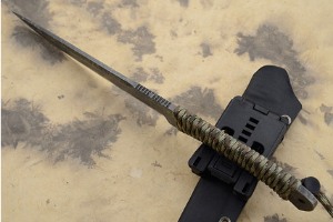 The Warabite Tanto is Kikuo's homage to the traditional Japanese tanto. It does not fall short of its namesake. The expertly balanced 7-1/2 inch blade is ground in Hamaguri-ba (convex) style from Kiku's favorite steel, OU-31 semi-stainless. It features his distinctive disruptive acid finish. A paracord wrapped handle and carved thumb notches on the spine provide a sure, comfortable grip. An all-around excellent choice as a stand-alone blade for extended ventures into unknown territory where every piece of your kit must be absolutely dependable!