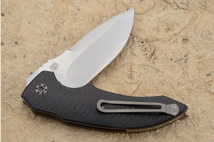 The handle is shaped from carbon fiber and fills out the hand perfectly. Bold curves for finger grooves and a gentle curving back ensure a secure grip in any position, while retaining a nimbleness that makes this knife feel as though it disappears in the hand. Anodized titanium liners and fittings round out the knife. The pierced titanium pocket clip is mounted for tip-up carry.