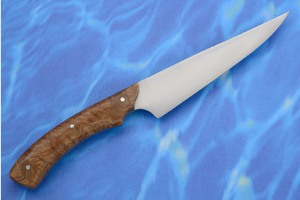 The 5-1/4 inch blade is formed from high performing 154CM stainless steel. It is hardened and triple tempered to 58-59 Hrc. A hand rubbed satin finish lends an heirloom quality. The blade is convex ground to minimize food sticking to the blade. Though this technique is much more difficult to create, it is much more effective than a granton edge, and is clearly worth the effort!