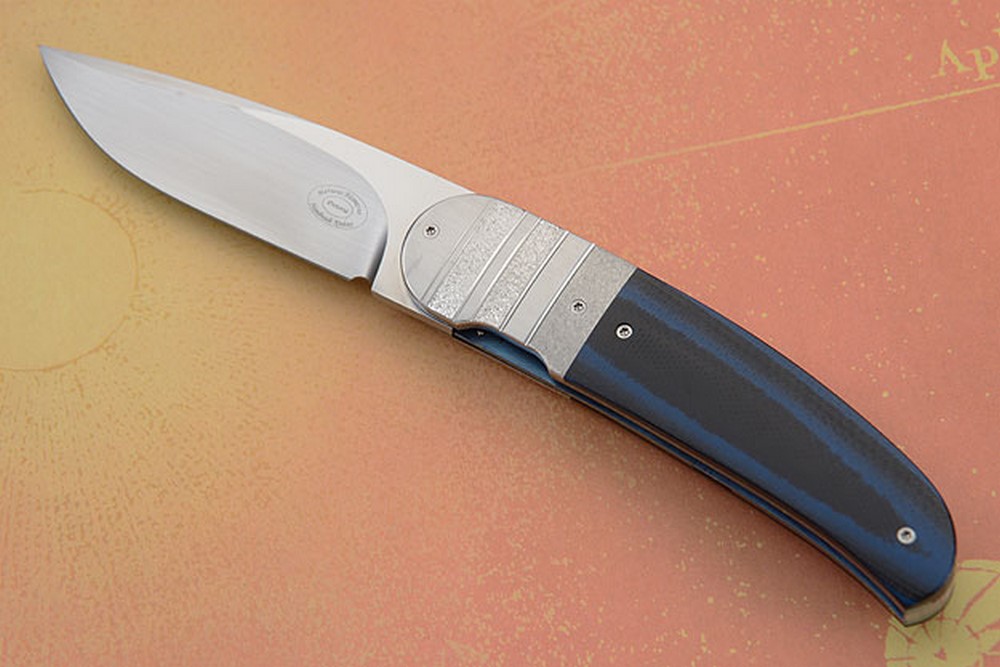 G10 scales are layered black and blue. Bolsters are grade 304 stainless steel, and have three bands of different hand texturing. Titanium liners are anodized blue and are hand fileworked in a vine pattern. A blue anodized titanium clip finishes off the blue theme.