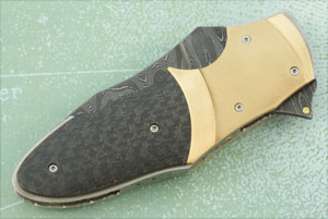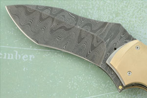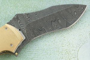 The blade is hand ground, high contrast damascus forged from carbon steels. The shape of the hollow ground blade is a recurve tanto and has a smooth, consistent action. It is easily opened using the flipper mechanism. A small Citrine jewel has been inserted into both sides of the flipper, for an added touch of elegance. A very usable yet classy piece -- able to hold up to use, but sure to feel comfortable in most any collection.
