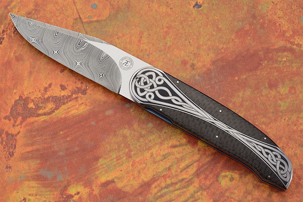 The 416 stainless steel frame is inlaid with two sections of black carbon fiber. Central arches of stainless steel have been meticulously hand engraved by Julien Marchal. Belgium-born artist Julien Marchal studied engraving and gun making at Léon Mignon Liège in Belgium and now lives in South Africa. Complex Celtic knots twist and writhe on the surface of the steel. Titanium liners are anodized to a light blue tone. The knife is accompanied by a fleece-lined soft pouch.