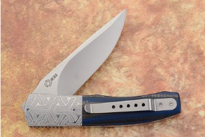 The scales combine thinly stacked layers of blue G10 and thick weave carbon fiber with mirror polished 303 stainless steel bolsters that are hand textured. By shaping the scales Andre creates a unique and attractive elongated chevron pattern that is handsomely complemented by the geometric patterning of the bolsters. Jimping on the thumb ramp ensures a secure grip. The flipper doubles as a front guard that keeps the hand from sliding forward onto the blade. The gently rounded handle feels sturdy and fills out the hand perfectly. The handle is completed with fileworked titanium liners that have been differentially anodized in blue tones. The stainless steel pocket clip is mounted for tip-up carry.