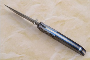 Carbon fiber scales are dovetailed to the bolsters for a perfect fit. Titanium liners have been anodized blue and keep the knife light and fast. Bolsters are Texture Tech titanium created by Mastersmith Tom Ferry, and are sculpted into a brambles pattern. The three dimensional effect is furthered by selective blue anodizing. The transition from the carbon fiber into the bluish brambles into the damascus is very appealing. A unique, classy folder with exceptional style.