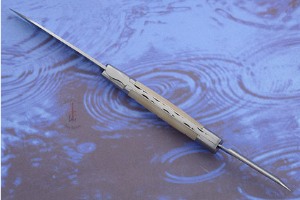 The light horn tip scales are accented with fine hand-set stainless pins and brushed stainless steel bolsters. The blade is crafted from 440 stainless steel, hardened to 54Hrc. The spring is made from 3mm thick Z20c13 stainless steel. The whole spring is then hand chased with a file – from the tip of the blade to the back bolster. Each knife features hand filework unique to the knife.