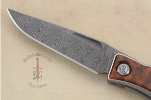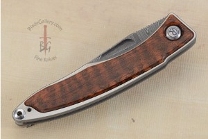 This Mnandi features premium snakewood scales with a stainless damascus blade. The wood is inlaid into the liners rather than being simple overlays. The blade is made from Devin Thomas' stainless ladder pattern damascus. The steel will have exceptional edge holding and is immediately captivating. Both the liners and pocket clip are formed from 6Al4V titanium, keeping this knife extremely light and durable. The clip is mounted for tip up carry. The knife can be comfortably opened and closed with one hand and locks open for safety. The thumb rest is fileworked for dependable handling. The Mnandi features a strong integral locking mechanism that Chris Reeve popularized.