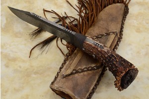 The handle is genuine stag crown, carefully hand selected, shaped, and finished. Visually impressive, the natural texture of the stag offers a sure, comfortable grip. Hand domed pins secure the hidden tang in place. A sinew wrap finishes the handle.
