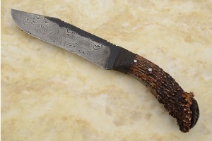 This Crown Stag Hunter features a damascus blade forged to shape from carbon steels. The grinds reveal the swirling, high contrast pattern. The flats feature a forge finished file-mark pattern. Daniel's touchmark is on the right side of the blade. A fileworked spine provides a comfortable thumb purchase.