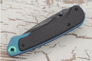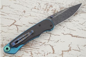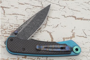 The Akribis is light weight and is created using only the best of modern materials such as, titanium, double deep cryogenically treated and tempered S35VN blades, carbon fiber, and ceramic bearings. A pocket clip set up for tip-up carry is included, and a hole is provided for a lanyard. The pocket clip is spot anodized and awesome! A dual anodized thumb stud allows easy one-handed opening. Rick Hinderer is credited for Lock Bar Stabilizer used in this knife.
