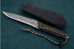 Hand contoured OD green canvas Micarta scales comprise the handle. The camo lanyard cord is secured with an amazingly simple yet very effective retention system. Comes with hand fitted Kydex sheath with Tek-Lok belt device.