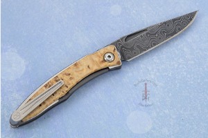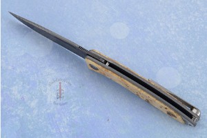 Handle: Box elder burl scales inlaid into a 6Al4V titanium frame