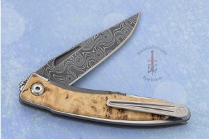 This Mnandi features premium box elder burl scales with a stainless damascus blade. The scales are inlaid into the liners rather than being simple overlays. The blade is made from Devin Thomas' stainless raindrop pattern damascus. The steel will have exceptional edge holding and is immediately captivating. Both the liners and pocket clip are formed from 6Al4V titanium, keeping this knife extremely light and durable. The clip is mounted for tip up carry. The knife can be comfortably opened and closed with one hand and locks open for safety. The thumb rest is fileworked for dependable handling. The Mnandi features a strong integral locking mechanism that Chris Reeve popularized.