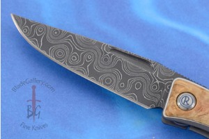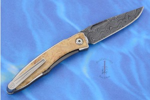 This Mnandi features premium box elder burl scales with a stainless damascus blade. The scales are inlaid into the liners rather than being simple overlays. The blade is made from Devin Thomas' stainless raindrop pattern damascus. The steel will have exceptional edge holding and is immediately captivating. Both the liners and pocket clip are formed from 6Al4V titanium, keeping this knife extremely light and durable. The clip is mounted for tip up carry. The knife can be comfortably opened and closed with one hand and locks open for safety. The thumb rest is fileworked for dependable handling. The Mnandi features a strong integral locking mechanism that Chris Reeve popularized.