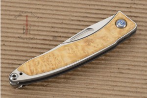 Handle: Box elder burl wood scales inlaid into a 6Al4V titanium frame