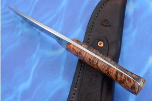 The box elder burl handle scales were stabilized by WSSI and will hold up well to the formidable demands of field use. This particular set of scales are particularly attractive and have a variety of colors evident, including a predominant orange. Three stainless steel pins set the wood in place on the full tang. Bruce has developed a tremendously ergonomic handle design - the forefinger rests securely in the choil while the remaining fingers curl comfortably around the perfectly contoured wood. The excellent heft and balance are ensured by the blade and full tang's distal taper.