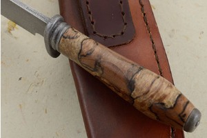 The blade was forged to shape from a worn out lumber mill saw blade. A distal taper ensures optimal balance. The carved spalted alder wood handle is very comfortable and provides a sure grip. The guard and pommel are wrought iron forged from an 1800s era anchor chain. All has been antiqued for a timeless appearance and feel. The knife is accompanied by a cowhide pouch style sheath. Excellent work throughout!