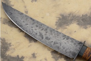 The guard, ferrule and end cap are forged from antique wrought iron. The wrought iron has a hammered finish which continues the timeless feel to the knife. The curly maple handle is gorgeous as well as comfortable in the hand. All edges have been rounded and smoothed and the end of the handle swells allowing a positive retention.