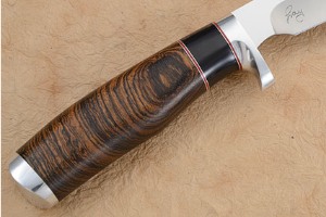 Premium bocote wood is handsomely offset by a jet black buffalo spacer. The wood's figure is very attractive and has a nice mix of warm brown and dark brown tones. The stainless steel guard and butt cap create a perfect balance in the hand. Alternating red fiber and stainless spacers assist the handle to adjust to temperature and humidity changes.