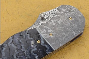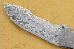 The hollow ground blade is formed from stainless Damasteel Damascus. The bold Odin's Eye pattern immediately grabs attention. It is easily opened using the stainless steel thumb stud. The blade is well centered with smooth action. Titanium liners have been anodized blue, and screws are gold plated. The liners surround a damascus backbar.