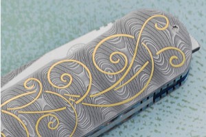 Description: This is among the most elegant folders created by Andre Thorburn to date. It combines stainless damascus scales and blade with 24kt gold inlay by Belgium-born artist Julien Marchal. Julien studied engraving and gun making at Léon Mignon Liège in Belgium.