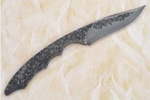The blade has been differentially tempered using a traditional Japanese clay technique. This method results in a gently undulating transition line called a hamon. The spine and handle have both been hammer textured for a very dramatic appearance. Subtle skulls float in the texture of the handle -- like spirits floating in the Aether.