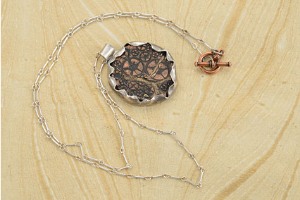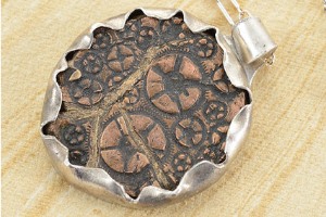 Description: This pendant is the work of Mastersmith Shane Taylor. The pendant clearly shows the influence of a steam punk aesthetic on Shane's work. Pure silver surrounds the articulated imprints of gears, seemingly frozen in time -- formed in copper. Shane's maker's mark, 'ST' in delicately engraved on the reverse of the pendant. The pendant measures approximately 1-3/4 inches in height, by 1-1/3 inches across. It is suspended by a 24 inch sterling silver chain with a copper clasp.