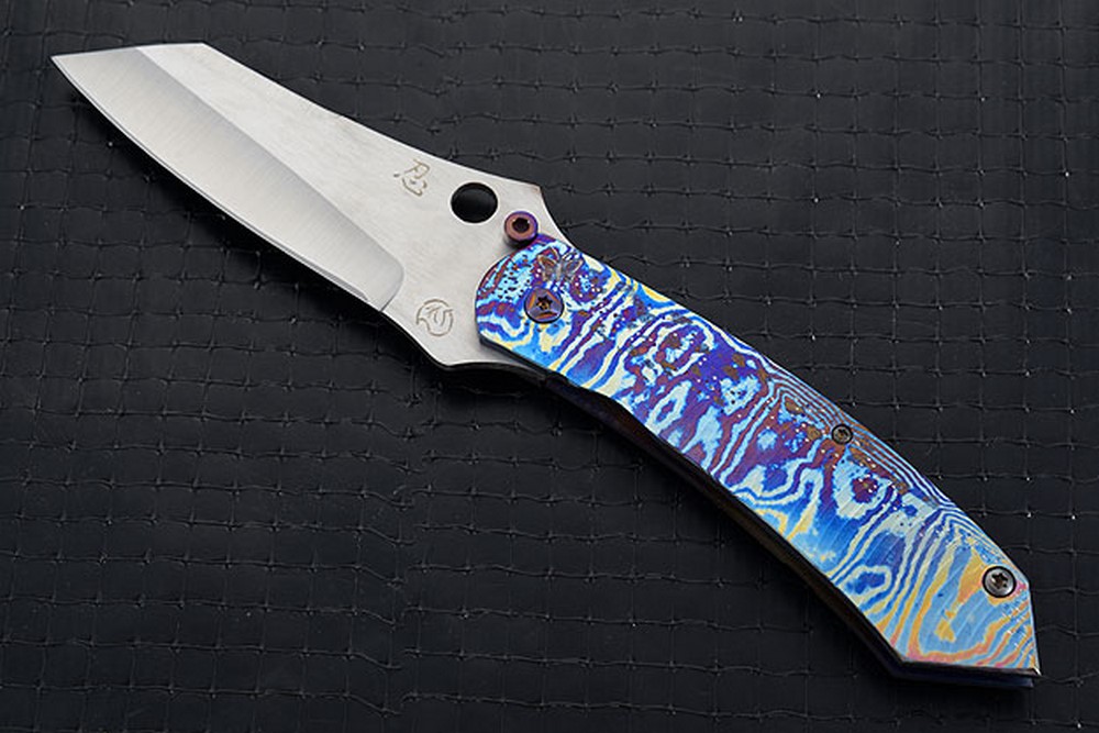 This unique folder combines a san mai ZDP-189 blade with a Timascus frame. The reverse tanto blade is formed from a ZDP-189 core sandwiched between ATS-34 stainless steel. ZDP-189 is a phenomenal steel, though unfortunately difficult to find. It is renowned for its amazing edge retention. The blade is textured on the flats and has a hole for one-handed opening. In addition, there is a single anodized titanium thumb stud, which also acts as a stop pin. Engraved next to the hole is the Japanese kanji for "Shinobi", which means ninja.