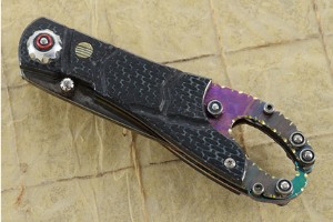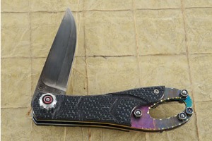 The damascus blade is formed from stainless steels. A VG10 stainless steel core provides exceptional edge holding and durability. Polished carbon fiber scales are set on anodized titanium liners, keeping the knife light and durable.