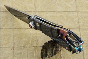 Description: Captain Koyama's designs are truly innovative. He designs and develops his knives with unique mechanisms that immediately capture the imagination. This one features a rear blade and a back clip that is accessed by rotating the heat blued titanium lock.