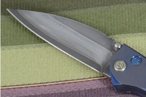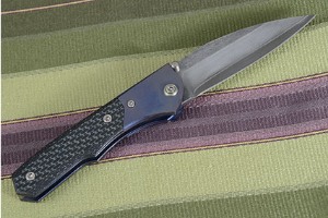The damascus blade is formed from stainless steels. A VG10 stainless steel core provides exceptional edge holding and durability. Polished carbon fiber scales are set on anodized titanium liners, keeping the knife light and durable. Excellent work throughout!